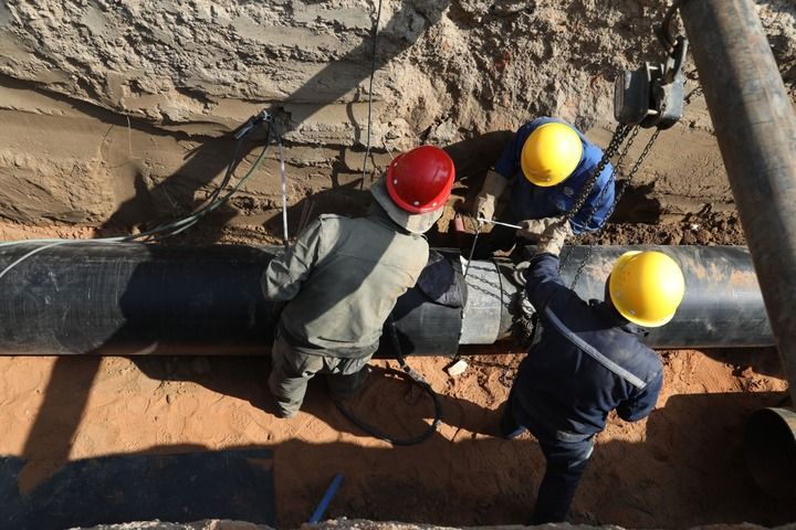 ??工人們在蘭州市皋蘭縣一處供熱改造項目現場更換供熱管道。(蘭州市委宣傳部供圖)