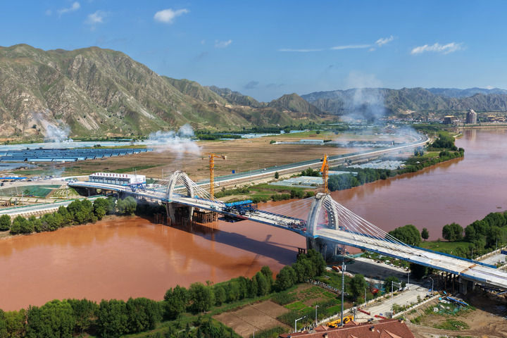 ??8月29日拍攝的蘭州什川黃河大橋順利完成中跨合龍(無人機照片)。(蘭州市委宣傳部供圖)