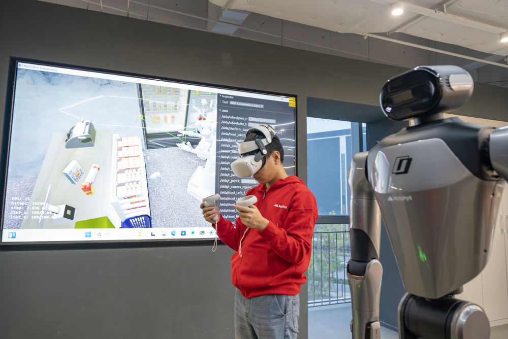 在虛擬超市中拿起一瓶飲料,現(xiàn)實(shí)中的機(jī)器人便同步取出一瓶飲料;在虛擬臥室疊好被子,機(jī)器人也能精準(zhǔn)將被子折疊整齊……在訓(xùn)練場(chǎng)現(xiàn)場(chǎng),記者通過(guò)VR設(shè)備親身體驗(yàn)了一把仿真訓(xùn)練的過(guò)程。