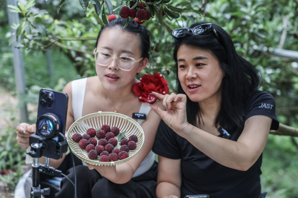 浙江省慈溪市大棚楊梅上市時,主播在樹下直播銷售楊梅 徐昱 攝